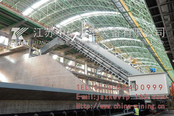 半門式刮板取料機,一條軌道在地面,一條軌道在空中,空間利用率提高了50%,同時提高了設(shè)備運行穩(wěn)定性。