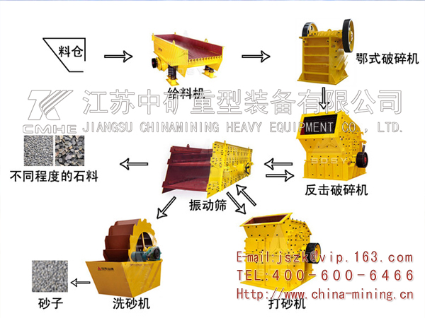 制砂生產線在工作過程中,大塊石料經料倉由振動給料機均勻地送進顎式破碎機進行粗碎,粗碎后的石料由膠帶輸送機送入圓錐破碎機(或反擊式破碎機)進行中碎,中碎后的石料由膠帶輸送機送進振動篩進行篩分,成品砂子(篩下物)由膠帶輸送機送至洗砂機清洗后再通過膠帶輸送機送至成品料堆;大顆粒石料(篩上物)由膠帶輸送機送至立式沖擊破碎機(制砂機)進行細碎,細碎后的石料由膠帶輸送機再次送進振動篩進行篩分,這樣形成閉路多次循環。