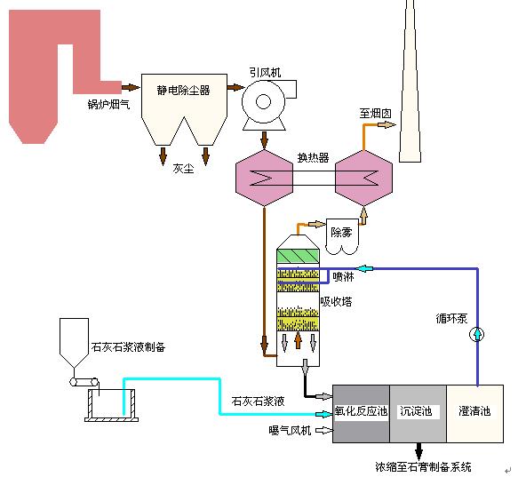 一、濕式石灰(石)/石膏法煙氣脫硫技術(shù),其工藝流程圖如上: 鍋爐煙氣在吸收塔內(nèi)與石灰(石)粉形成的漿液進(jìn)行逆流接觸反應(yīng)。吸收塔下段低PH值有利于氧氣和石灰石溶解,上段較高PH值有利于吸收反應(yīng),提高脫硫效率。