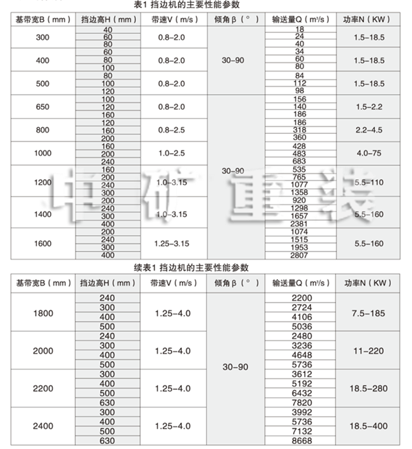 本系列產品的主要性能參數見表1。表中輸送量式按300傾角、該規格許用帶速和橫隔板間距計算的。