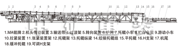 落地側(cè)裝式鋼架為機(jī)身,上托輥組間距為1 2或1 5米,下托輥組間距為3米。托輥組設(shè)有前后調(diào)整位置,通過調(diào)整托輥組位置來調(diào)整輸送帶的跑偏。托輥均采用沖壓軸承座托輥,設(shè)有雙重密封,具有重量輕、密封性能好、旋轉(zhuǎn)阻力小、使用壽命長(zhǎng)等特點(diǎn)。